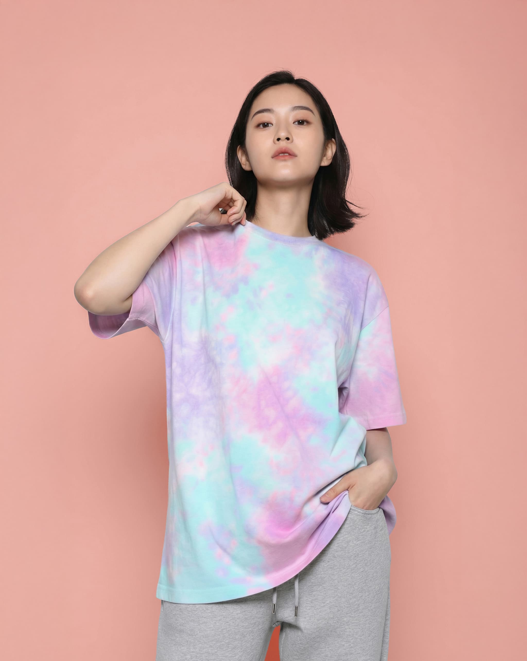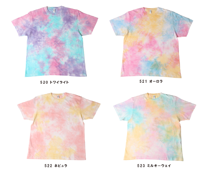 淡くにじむタイダイで、星雲のような奥行きを表現。まとうだけで印象が変わる1枚。無地でも人気。